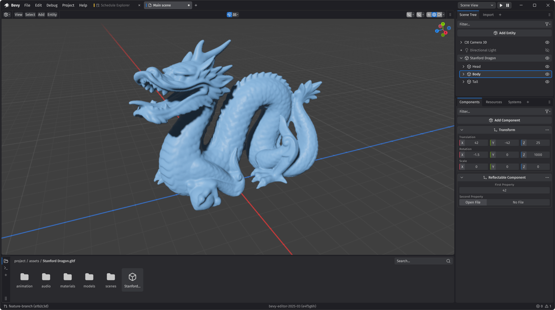 The Bevy Editor design group has made significant progress on the Bevy Editor's structure and design language. See the group's collaborative Figma design doc for a breakdown (this was the work of many, but a huge thanks to Rin for facilitating this effort). This is still very much a work in progress (and I haven't personally done a design pass yet, just high level notes here and there), but the design is looking beautiful and functional so far: